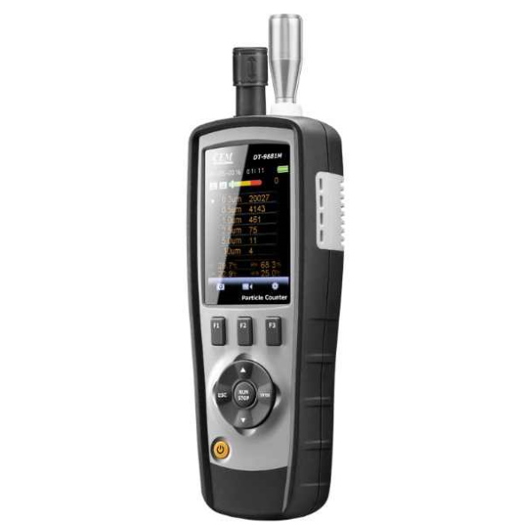 The CEM DT-9883M Air Particle Counter has many functions. With it is possible to determine the number of particles in the size of 0.3, 2.5 and 10 µm. In addition to measuring the particles, the fine dust it can also measure the PM 2.5 and PM 10 mass concentration. The mass concentration of the fine dust determines the weight of the particles in one cubic metre.